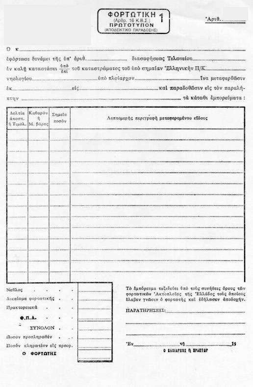 Το παρόν έντυπο είναι αντίγραφο φορτωτικής η οποία χρησιμοποιείται σύμφωνα με την ελληνική νομοθεσία για τις θαλάσσιες μεταφορές φορτίων μεταξύ των ελληνικών λιμένων. Σύμφωνα με την ελληνική νομοθεσία οι μεταφορές αυτές υπόκεινται σε Φ.Π.Α. και το παρόν αποτελεί αποδεικτικό της μεταφοράς και της αξίας του ναύλου.