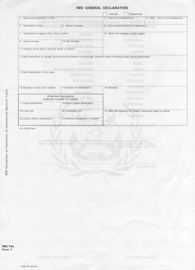 This is the speciment of an IMO general declaration form which is based on IMO Convention on Facilitation of International Maritime Traffic. This form is used upon arrival of a ship at a port and includes : the particulars of the vessel, brief particulars of the voyage and a brief description of the cargo. This document along with other attached documents (Cargo Declaration, Crew List, Crew's Effects Declaration, Ship's Stores Declaration, Passenger List, Maritime Declaration of Health) is handed over to the port authorities upon arrival of the vessel.